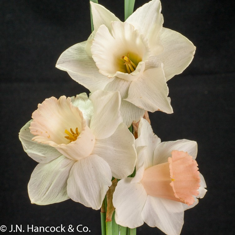 2W-P Stunning quality flower; broad white petals and a large true pink cup that matures to the palest pink. Strong stem, tall growing. Early-mid.