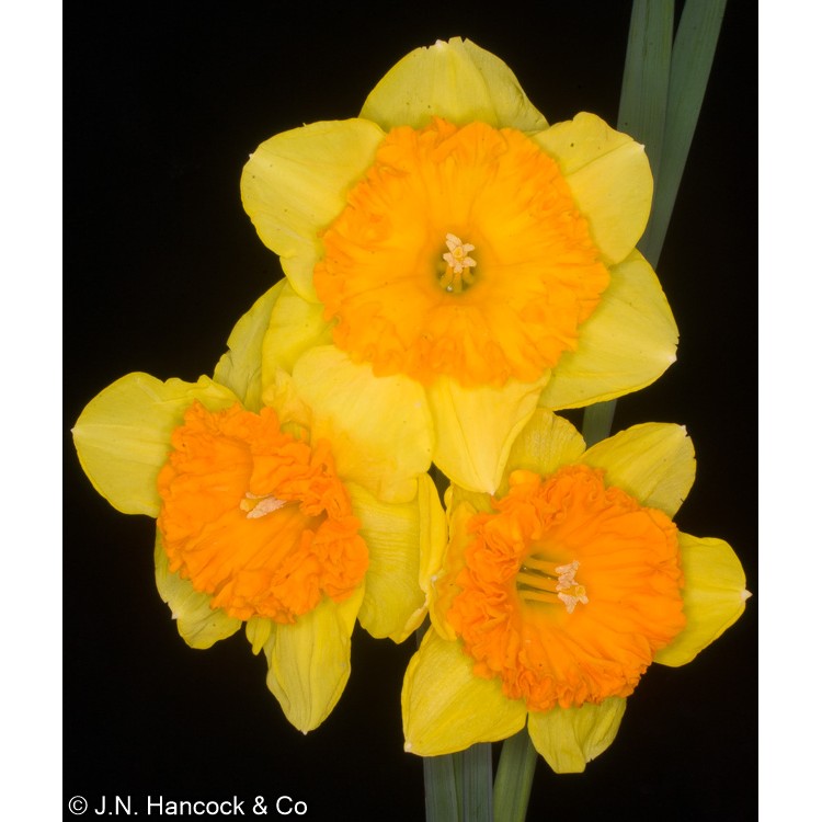2Y-O A striking decorative bloom; spectacular, vivid orange flat bowl-shaped crown is very heavily frilled; bright-yellow perianth. Sturdy. Early-mid.