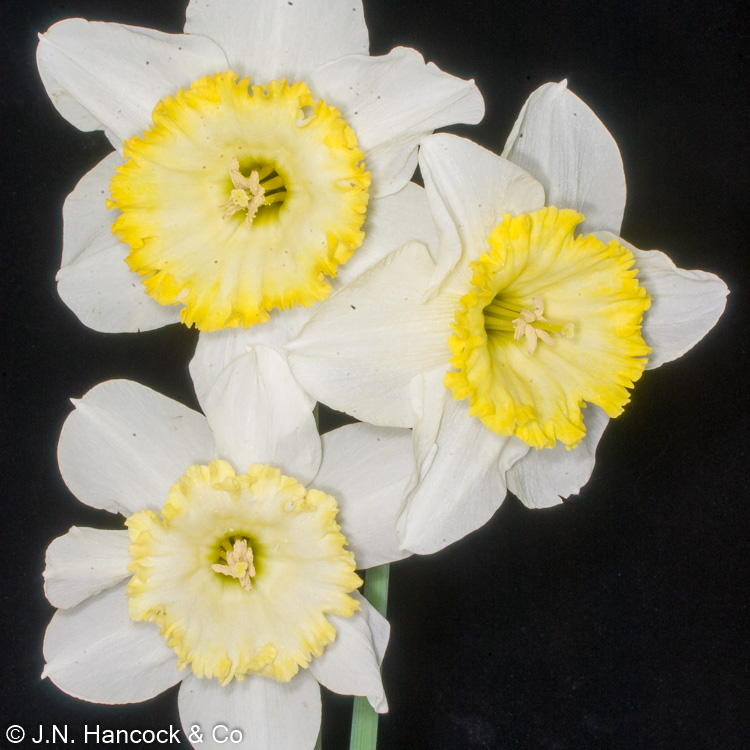 2W-WWY Return of a much lauded historic decorative variety. White petals surround a wide spreading cup that is heavily ruffled and edged with soft yellow. Early-mid.