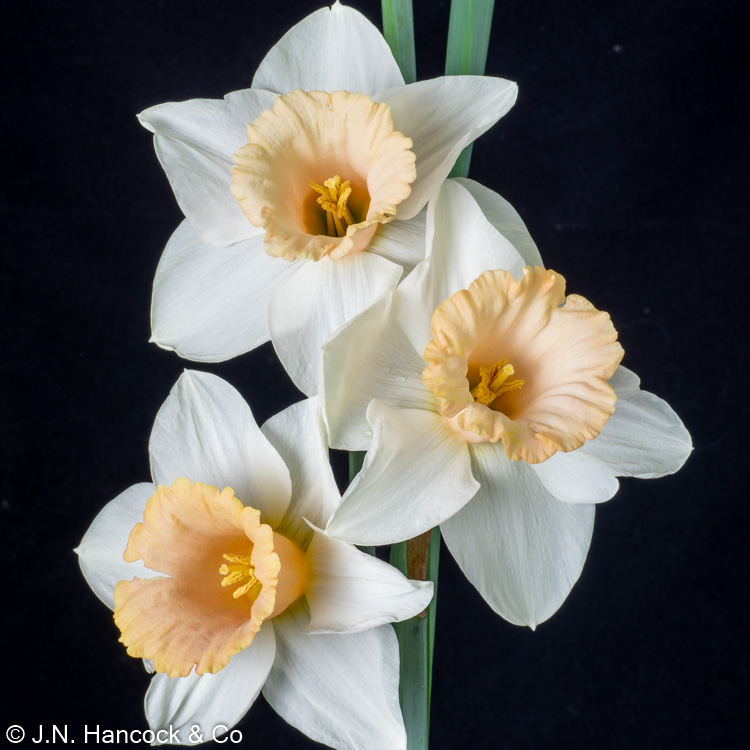 2W-P A splendid newly released bloom with a pale apricot-pink expanded fluted cup and informal white petals. Mid.