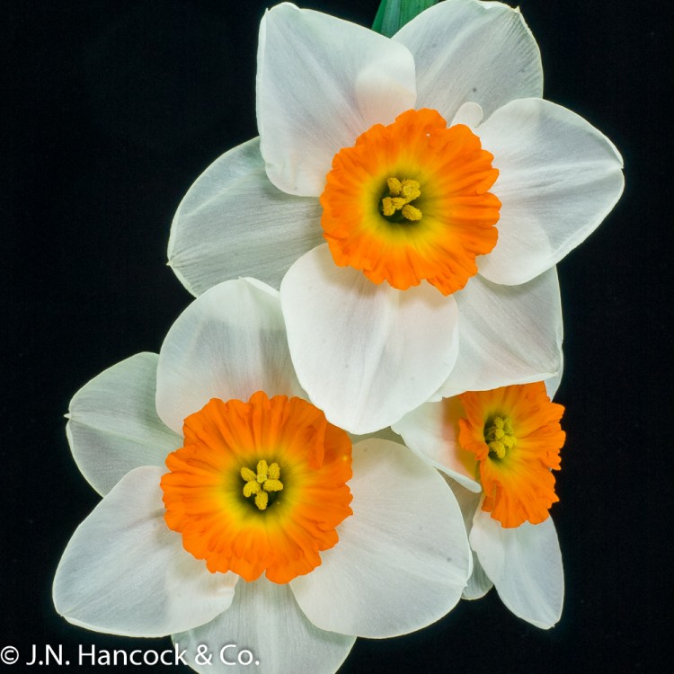 3W-GRR Impressive bloom; the white perianth contrasts with the saucer-shaped crown of orange-red with a green eye. Mid.