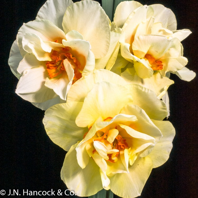 4W-O Outstanding sweetly scented double; the ice-white outer petals are interspersed with smaller segments of brilliant orange-red. Vigorous. Late.