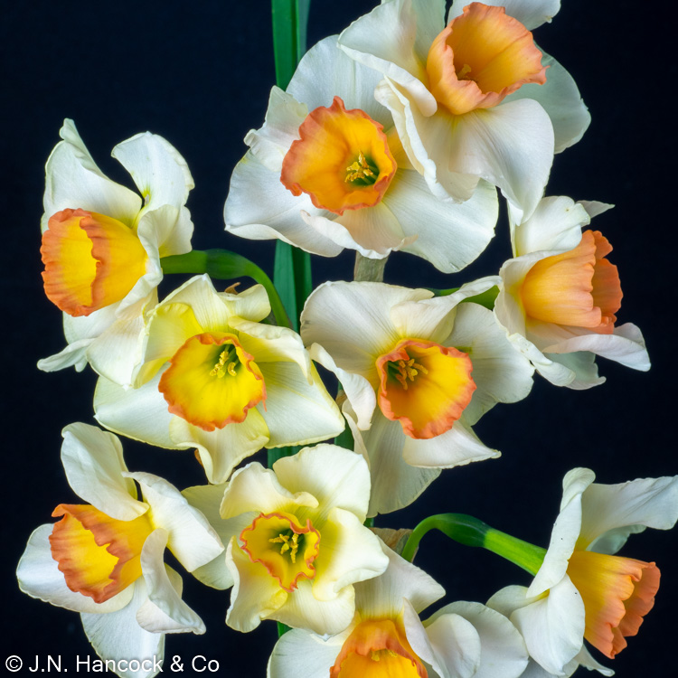 7W-P The remarkable colours and long flowering are highlights of this jonquil. White petals and a cup of orange-yellow banded with fiery-pink. Mid-late.