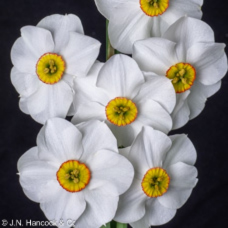 9W-GYR Very classy flower sure to excite daffodil show judges. Flat rounded cup and petals of perfect form - what else could you want? Scented. Late.