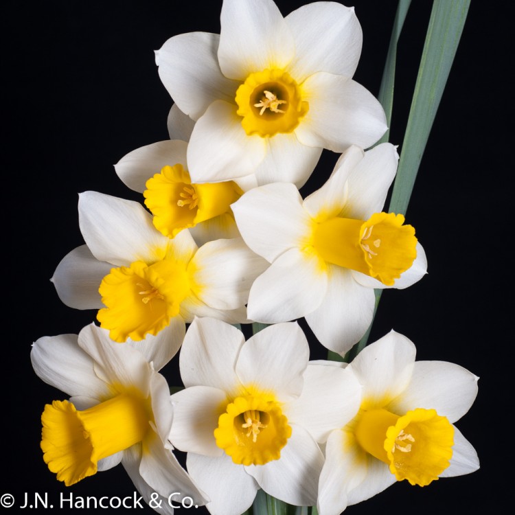 2WWY-Y Stylish flower; the ivory-white overlapping petals have a brilliant yellow band at the base and are crowned by a bold, large cup of brightest yellow. Mid.
