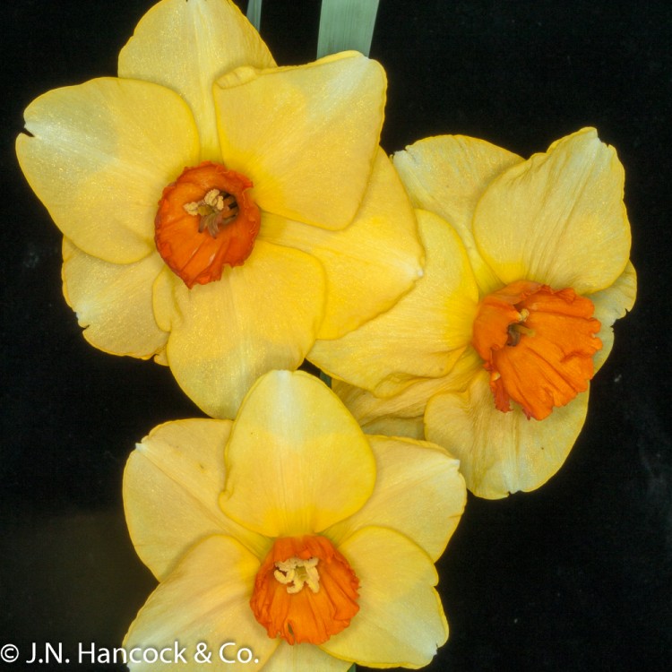 2O-R Flower of unique colouring. The well-formed corona is orange-red and complements the unusual orange petals. Mid-late.