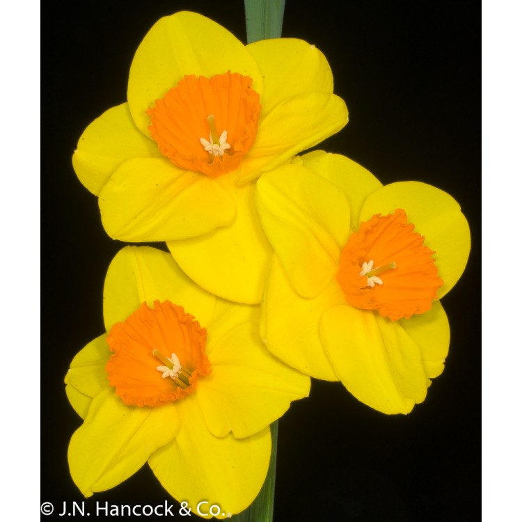 2Y-O Magnificent bloom with rich, deep yellow perianth and a large, brilliant orange straight cup with a serrated edge. Mid-late.