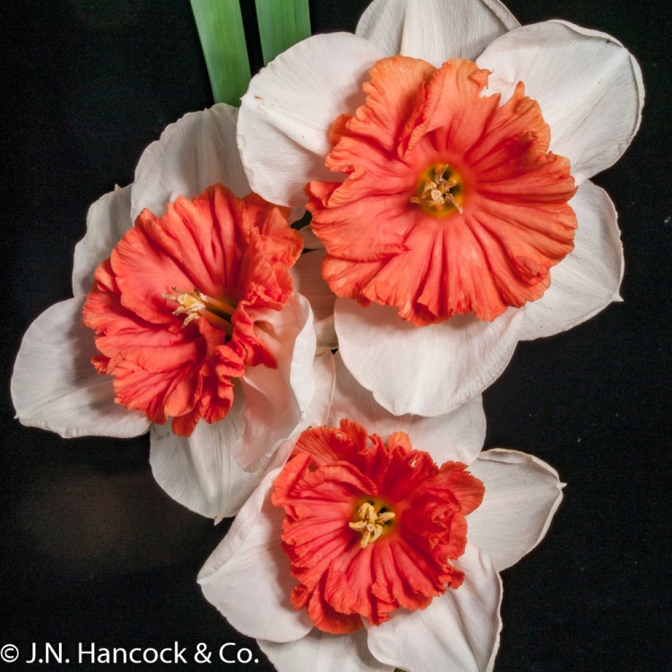 2W-P A remarkable daffodil. The deep plum-red large spreading cup is a riot of colour backed by sturdy white petals. Mid.