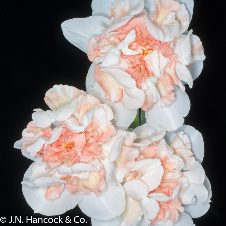 4W-P A spectacular bloom. The deep rose-pink bowl-shaped crown is heavily frilled and complemented by a broad white perianth. Late.