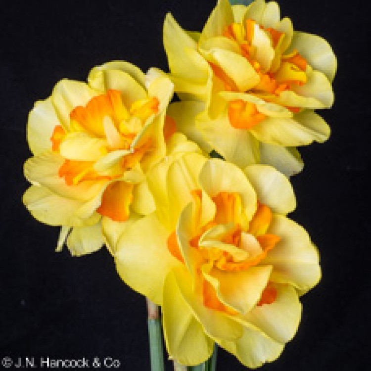 4Y-O An excellent double with golden petals interspersed with tangerine segments on a strong stem. Bred by Hancock’s. Tall. Late.