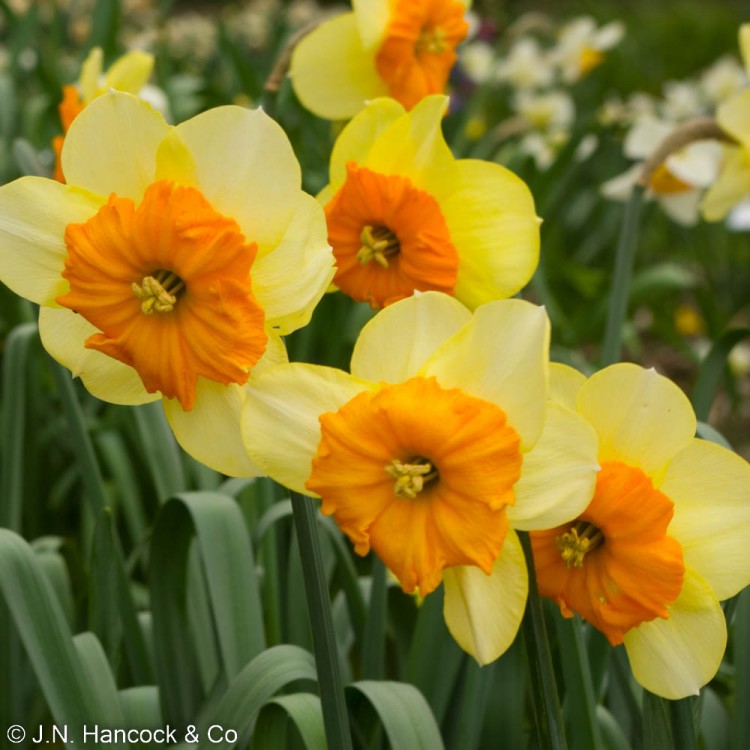 2Y-O Large striking flower; deep tangerine-orange corona is reflexed back against soft yellow petals. Mid-late.