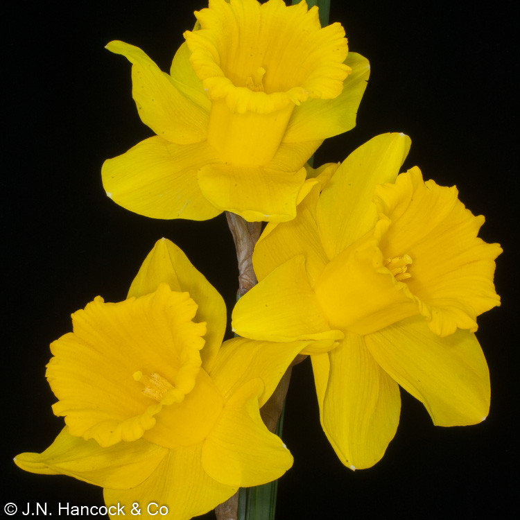 1Y-Y Striking large trumpet daffodil. The golden-yellow self-coloured bloom has a prominently rolled rim. Mid.