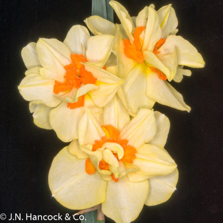 4Y-O Formal flower with layers of luminous-yellow petals contrasting with striking red-orange inner petals and yellow petaloids. Mid.