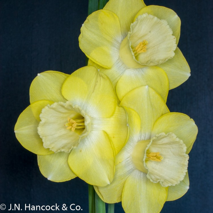 2Y-W A striking large exhibition flower of excellent substance with smooth lemon petals and a well proportioned cup that whitens with maturity. Mid-late.