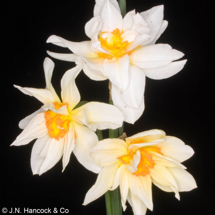 4W-O Open, ‘fly-away’ double. The long, narrow, white and yellow petals are interspersed with short brilliant scarlet-orange petals. Mid.