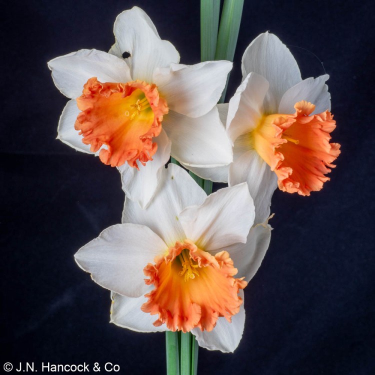 2W-YRR Startling bloom with an informal orange-red ruffled cup with a yellowish base backed by a pure- white perianth. Strong. sel jnh T6757