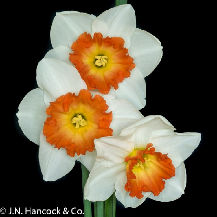 2W-YPP A most striking flower. Large flared, nearly flat crown of coral-red with a creamy yellow centre; excellent rounded white petals. Late.
