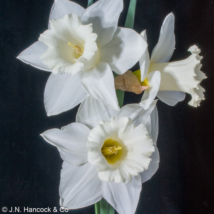 1W-W Magnificent large flower, the trumpet opens soft-yellow then matures to sparkling pure white. Tall. Vigorous. Mid.