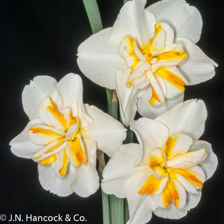 11bW-Y/OW Striking beautiful open segmented split-corona has radiating spokes of cream, yellow and orange; white petals. Late.