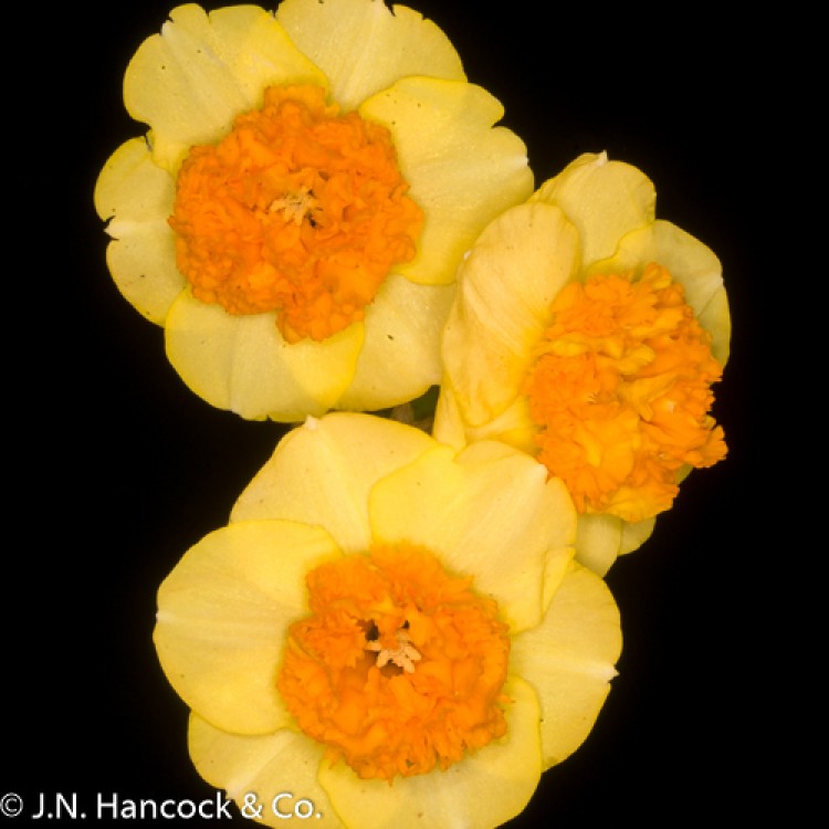 2Y-O A large, eye-catching bloom. The smooth, round, golden-yellow petals contrast with the magnificent, brilliant orange, heavily ruffled and pleated crown. Mid.