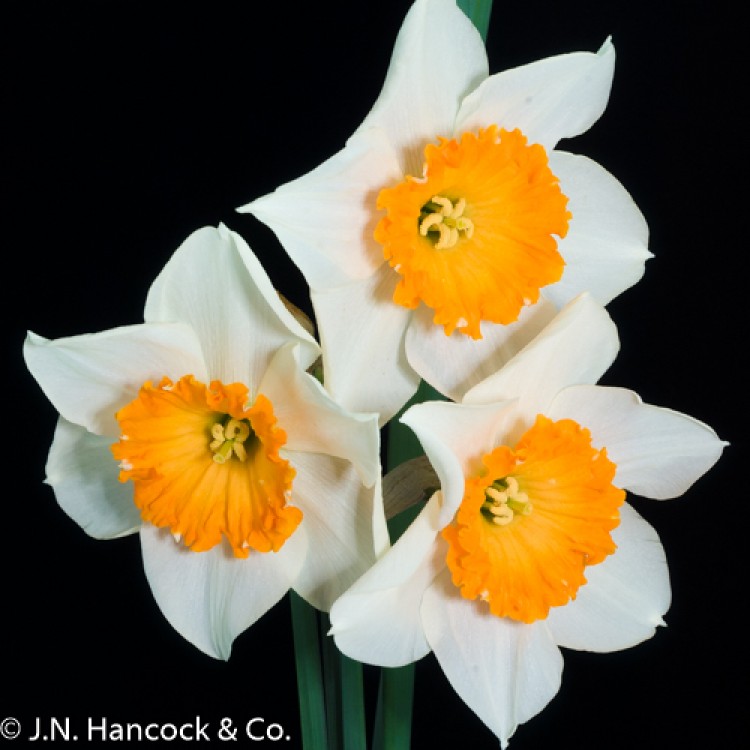 A large eye-catching bloom. Startling, pleated, flat cup of bright glowing orange-red; flat white petals. Tall, perfumed. Early-mid.