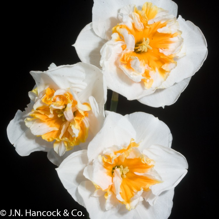 11bW-O/YW A beautiful bloom with sparkling white petals and a ruffled split-corona of bright apricot-orange, highlighted with white. Early-mid.