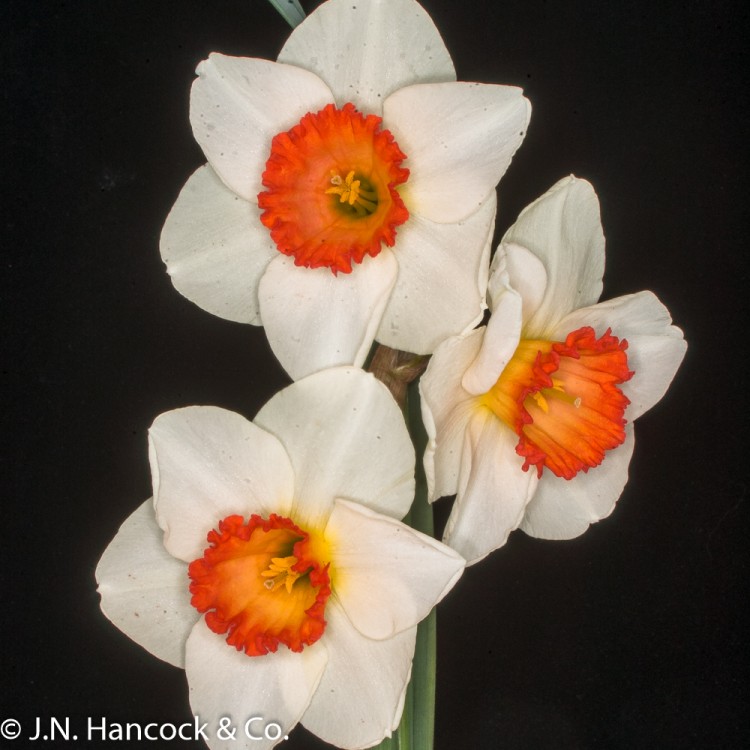 2W-PPR A magnificent bloom with a brilliant, deep coral-pink flared long-cup, serrated at the edge. Backed by a beautiful, broad, smooth pure-white perianth. Late.