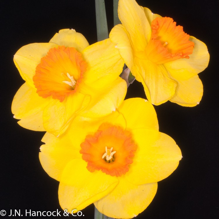 2Y-O Striking flower of intense colour. Very deep-red cup shaped corona with broad golden-yellow petals. Strong stem. Early-mid.