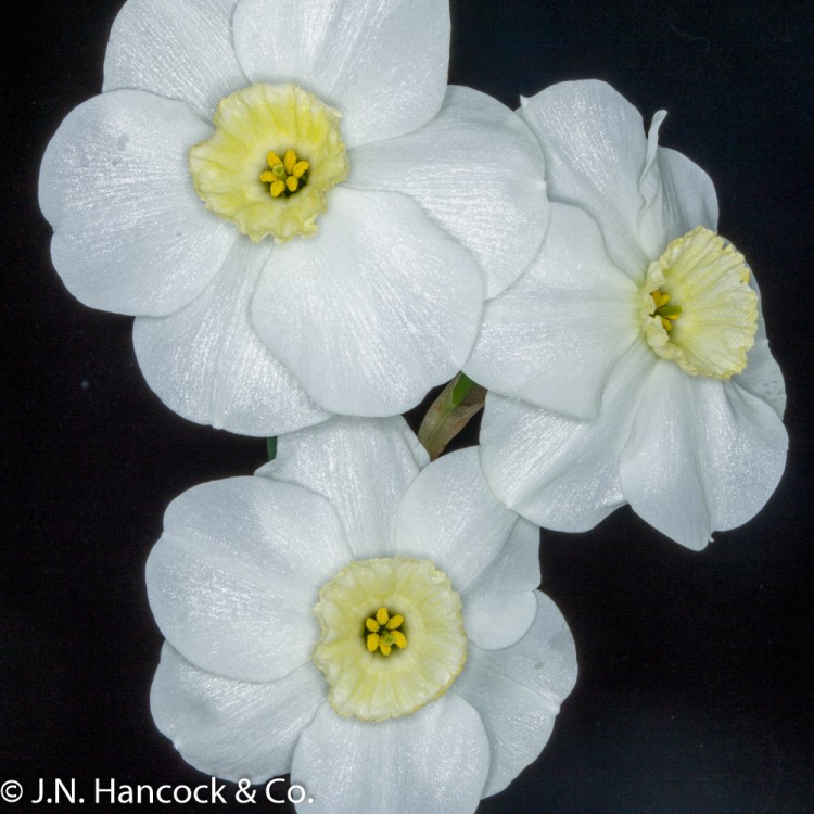 3W-W A striking pure white small cupped bloom with a pleasing green eye. Excellent exhibition flower. Mid.